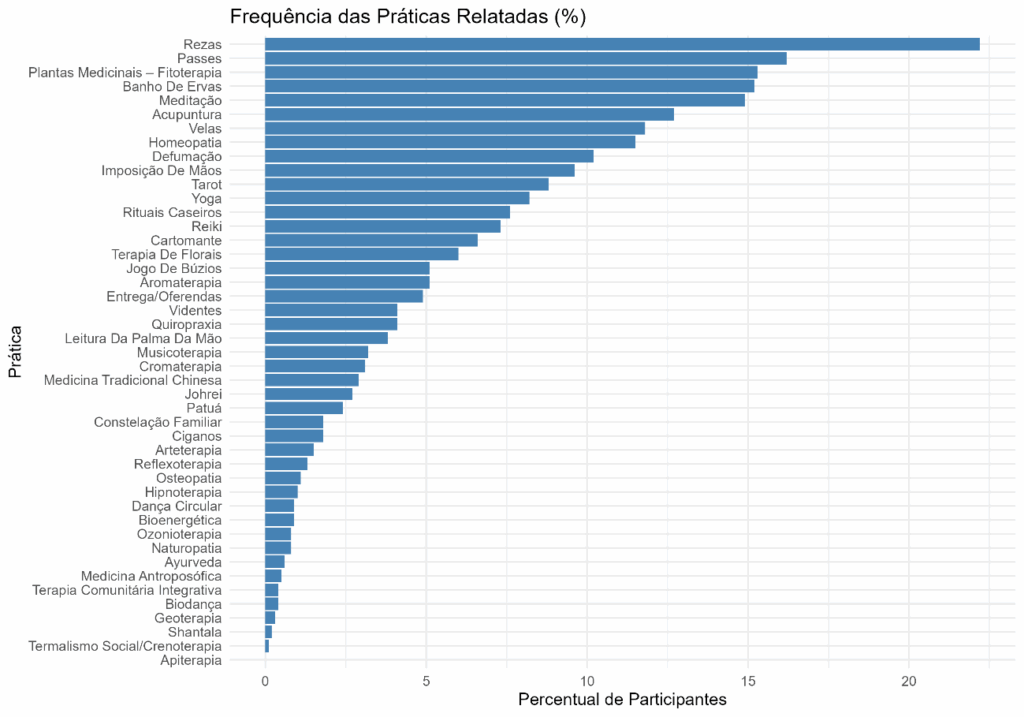 A prática mais comum foi a reza, adotada por 22,2% da amostra. Em seguida vieram passes espirituais (16,2%), plantas medicinais (15,3%), banhos de ervas (15,2%) e meditação (14,9%). Esses números mostram como o cuidado no Brasil mistura fé, tradição e bem-estar.