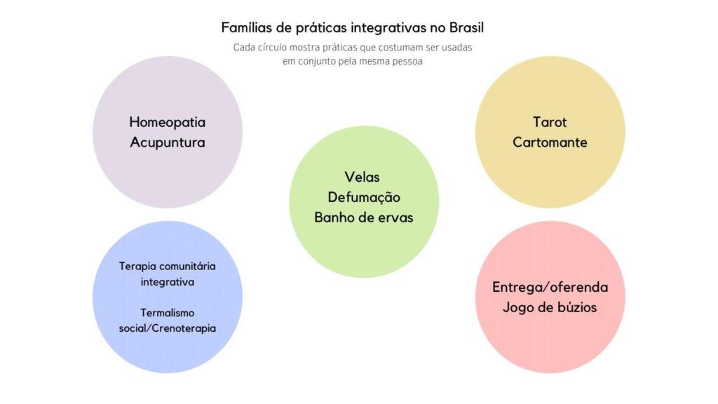 Essas combinações formam “pacotes de cuidado” que expressam modos de viver o bem-estar em um cuidado integral. Em alguns casos, estão ligadas a tradições religiosas; em outros, a formas de lidar com o sofrimento fora da medicina convencional para aliviar sintomas.
